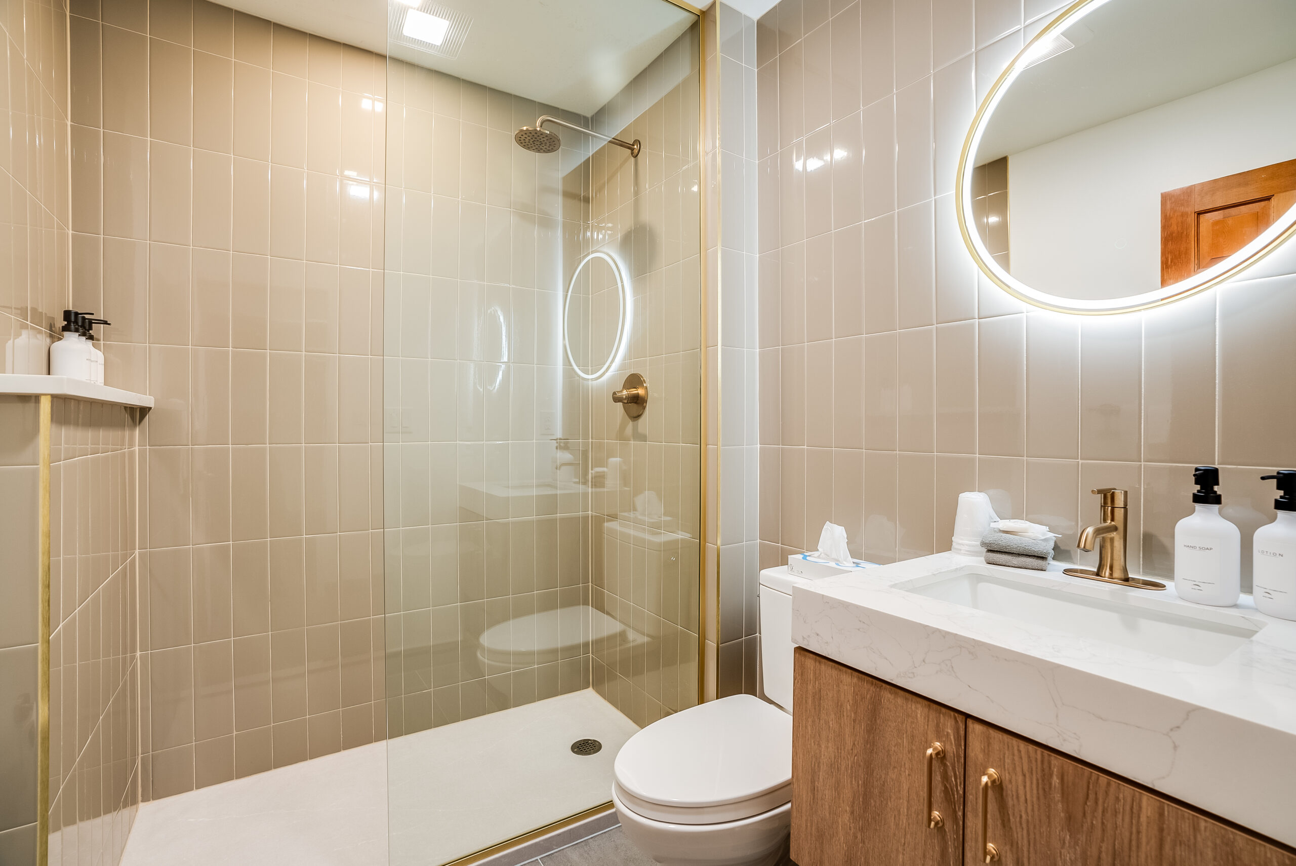 - Tiled shower and tub